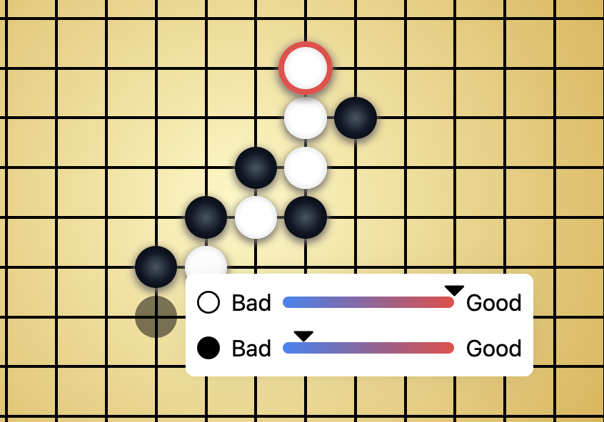 Right-click a board intersection to evaluate that position (desktop only; not available on touch/mobile). The minimax engine analyzes the position and shows which player would benefit more based on the current game state.