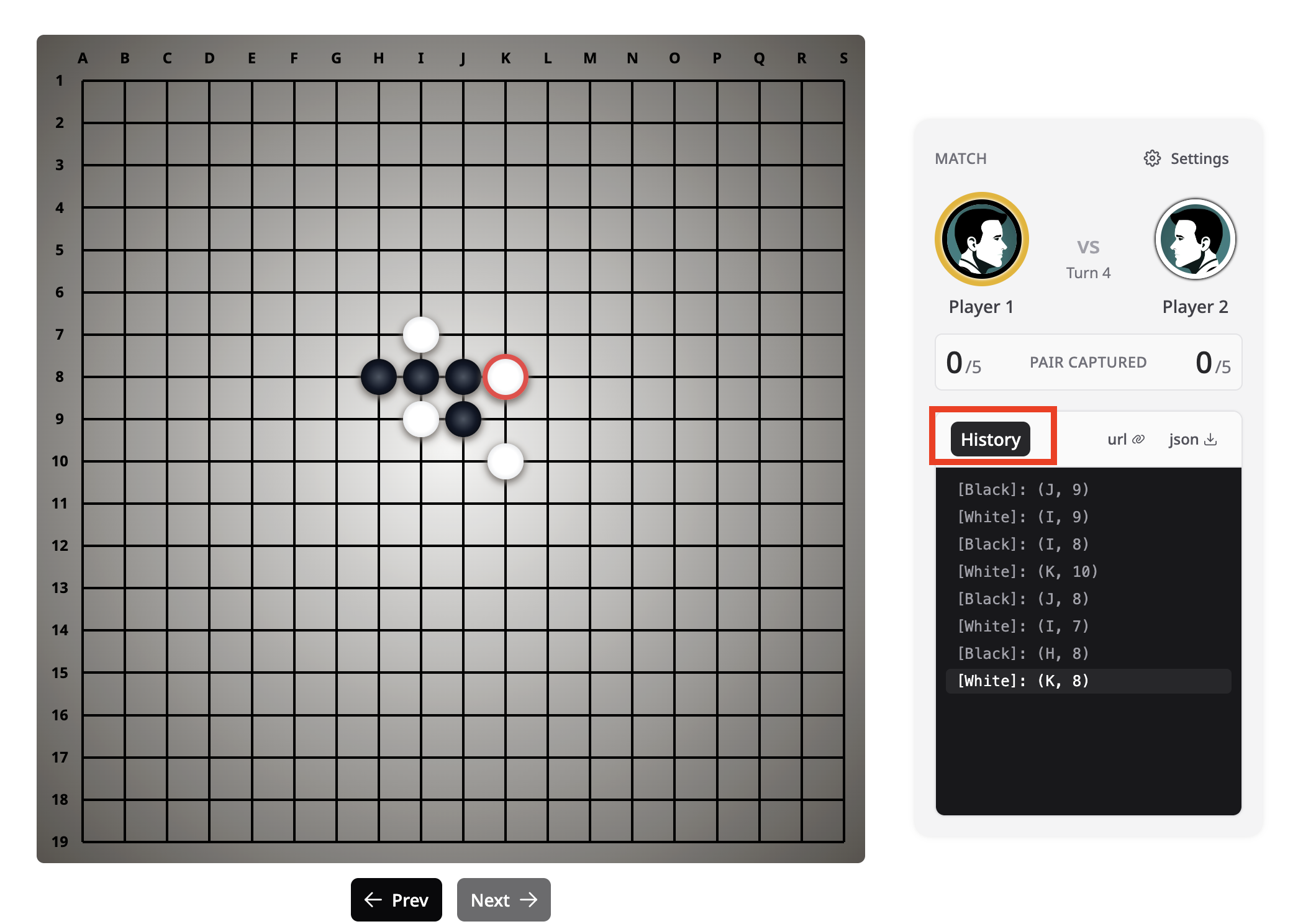 Navigate through previous moves without affecting the current game state. Toggle history mode via the Game history button in the sidebar, then use Prev / Next to step through the move sequence.